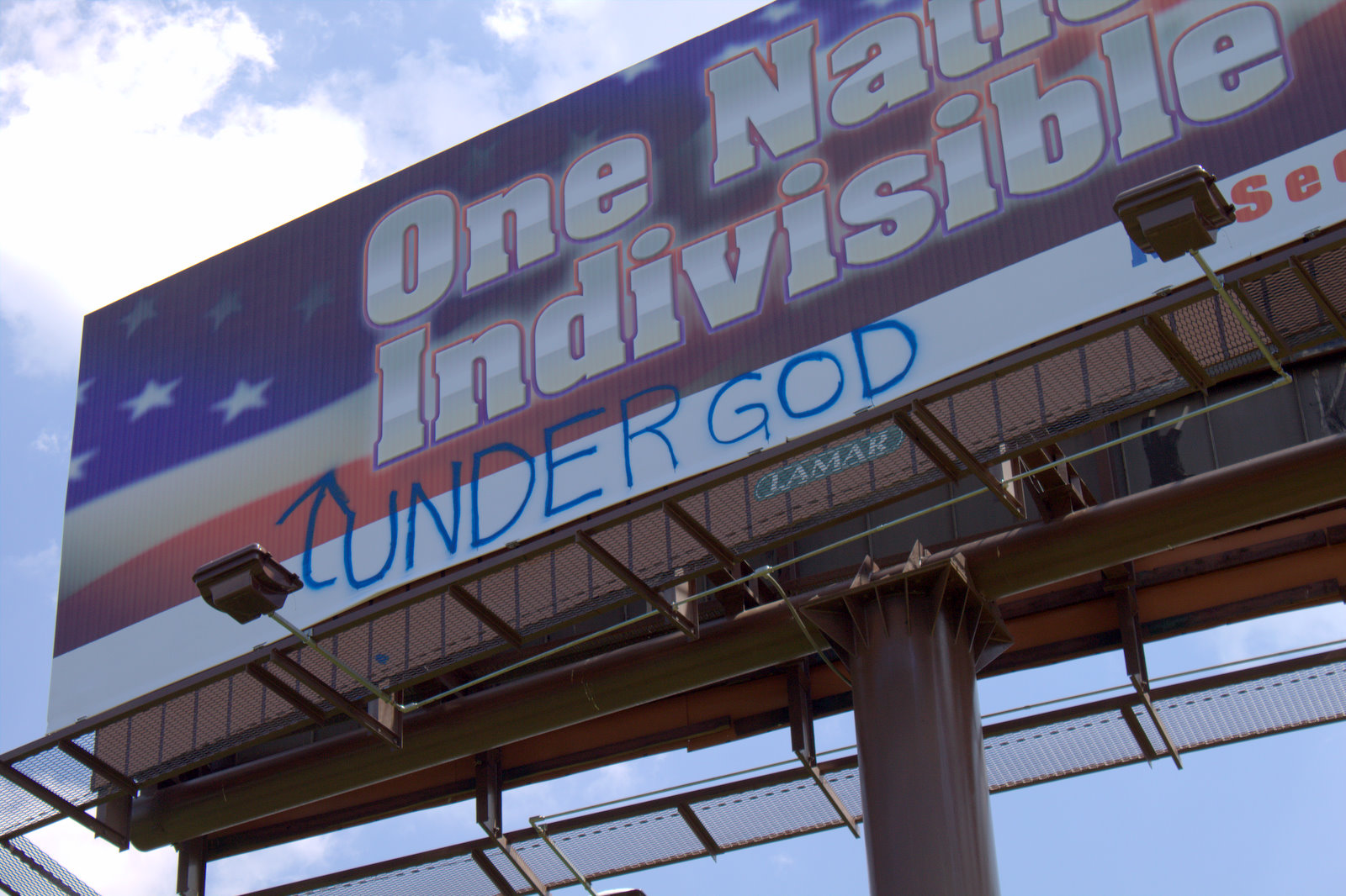 (North Carolina, June 28, 2010) Over this past weekend, one or more vandals defaced with spray paint part of the "One Nation Indivisible" billboard on the Billy Graham Parkway. The words "under God" were added below "One Nation Indivisible" with an arrow indicating their placement between "One Nation" and "Indivisible." The billboard had first appeared Monday, June 21, and is near the Boyer intersection.